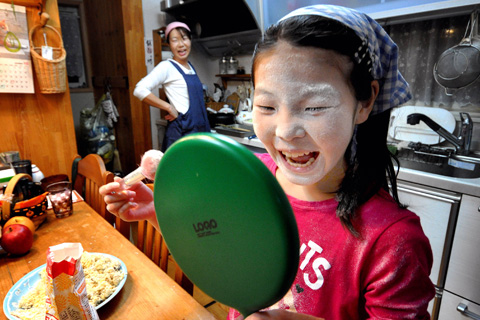 いつも仲良しの母娘。何やら娘は小麦粉でメイクタイム?爆笑のひとときでした。