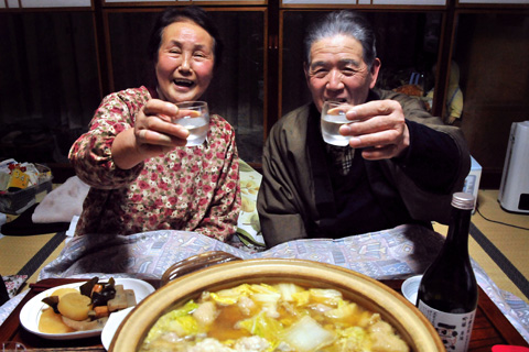 我が家の夕食時、お鍋を前に父母の乾杯のひと時です。