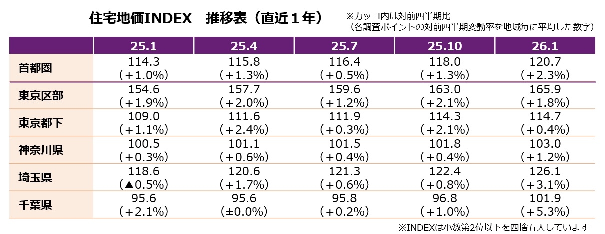 野村不動産ソリューションズ実勢調査による2026.1.1時点の首都圏「住宅地価格」の動向