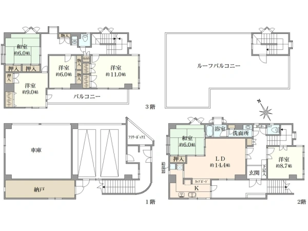 ・3階:洋室11帖、洋室9帖、洋室6帖、和室6帖