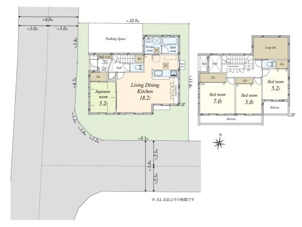 建物面積 100.61m2(30.43坪)(公簿) 1階:56.31m2 2階:44.3m2