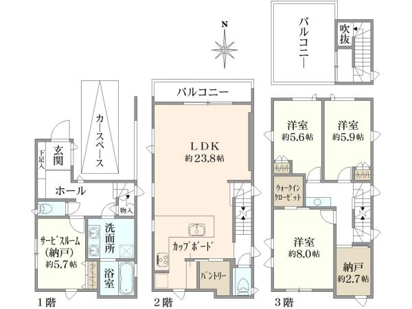 建物面積 150.4m2(45.49坪) (車庫面積:16.22m2含) 1階:50.33m2 2階:47.16m2 3階:48.36m2 その他:4.55m2