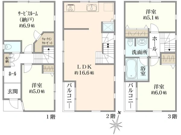 89.6m2(27.1坪) 1階:30.38m2 2階:29.61m2 3階:29.61m2 |