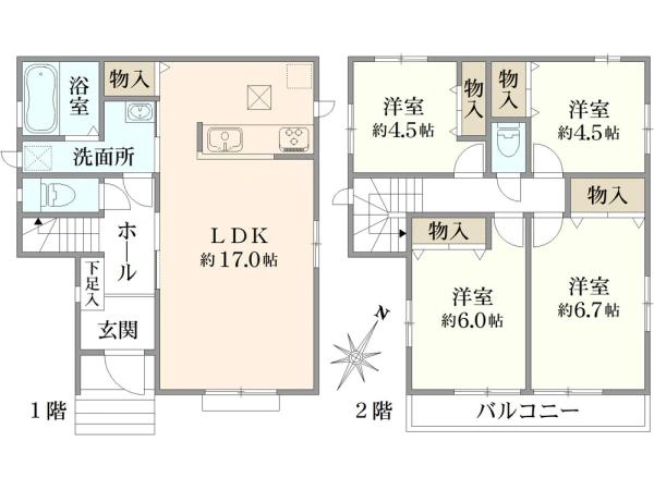 95.22m2(28.8坪) 1階:46.78m2 2階:48.44m2 |
