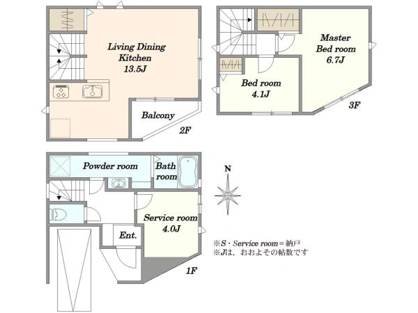 81.35m2(24.6坪)(公簿) 1階:28.99m2 2階:28.99m2 3階:23.37m2 |