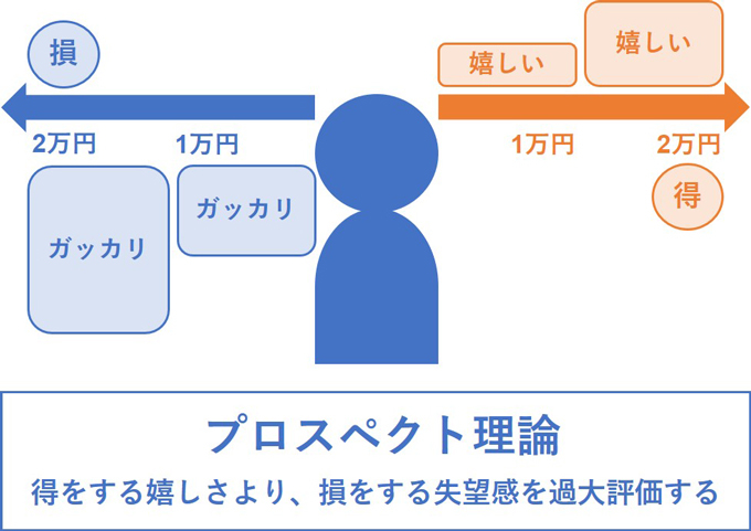 このように、人は「得をするうれしさよりも、損をする失望感を過大評価してしまう」傾向があることを理論的に証明したのがプロスペクト理論です。