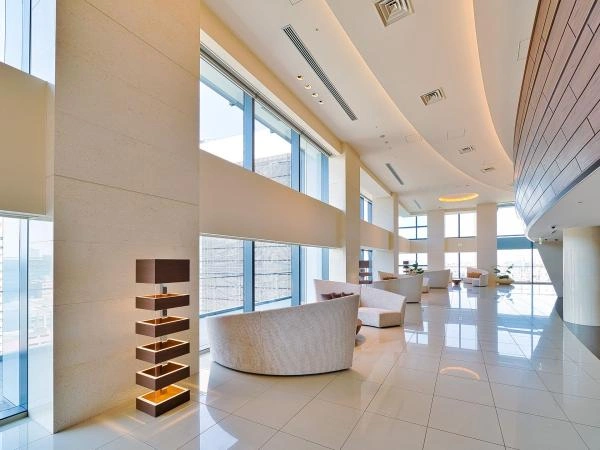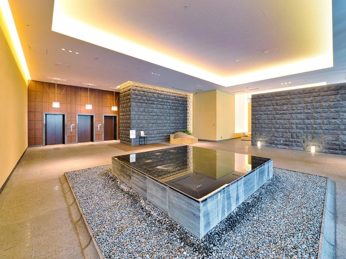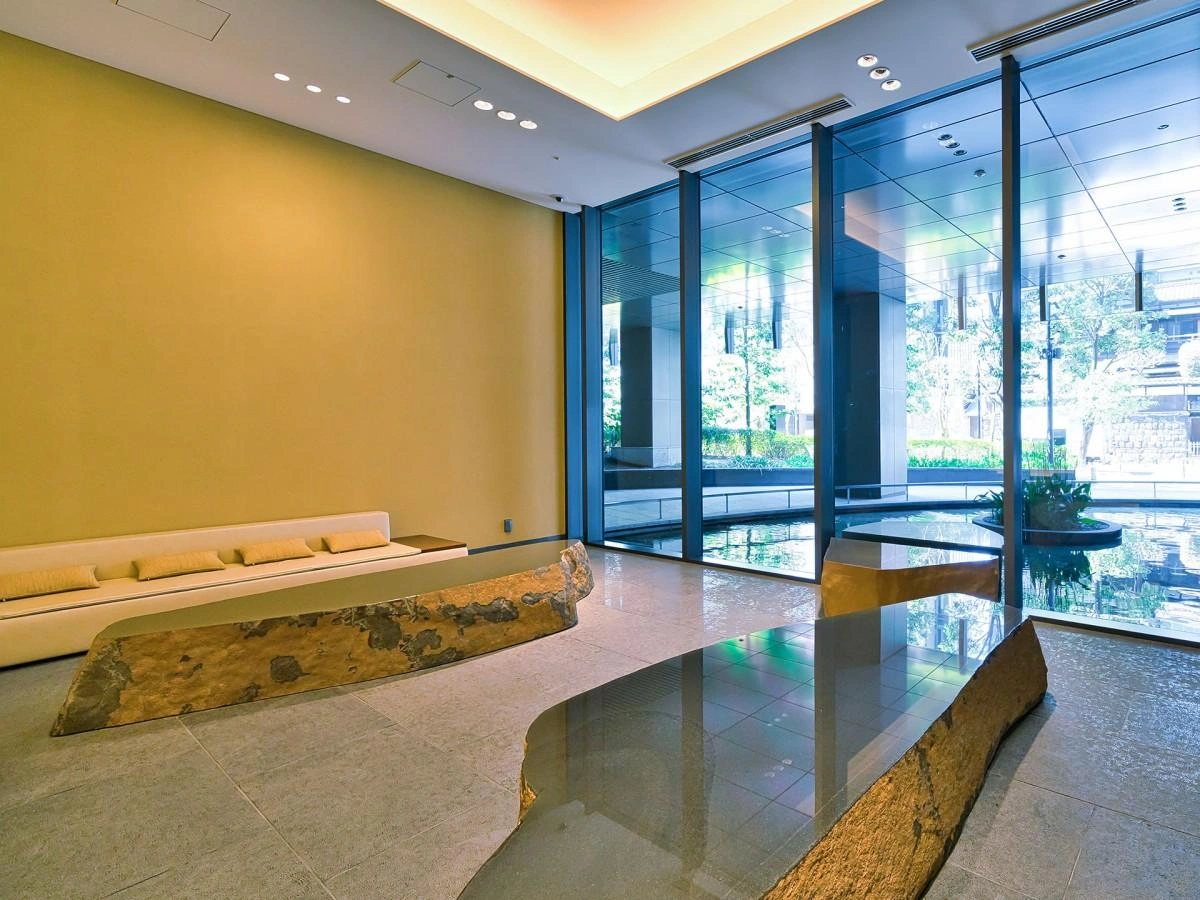 ■ウェルカムラウンジ ( 3階)石垣と水盤の景色が時の流れを緩やかにする空間