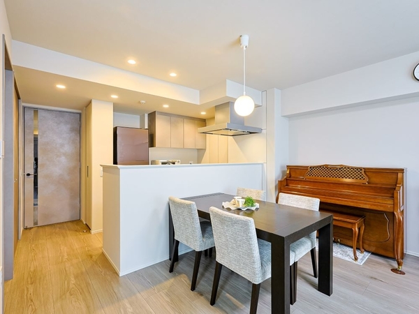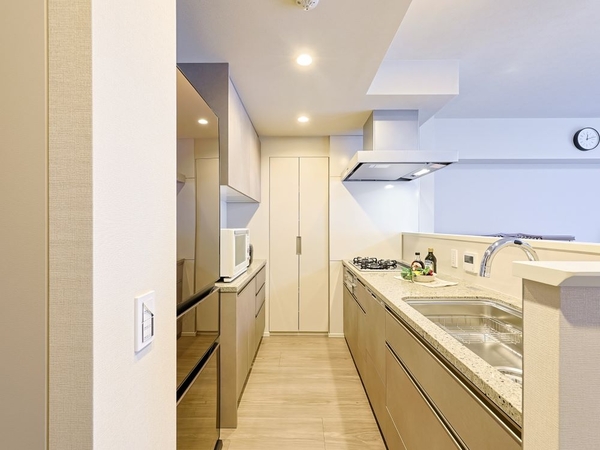 対面式のオープンなカウンターキッチンで、家族でのコミュニケーションも取りやすく、キッチン越しの家族での会話を楽しんでいます。キッチン上部に戸棚がない分、リビング、リビングダイニングに隣接する洋室まで見えるため、家事をしながら、子どもの様子が見え、安心していました。また開放感もあり、調理スペースも広く、清々しい気持ちで料理することができています。また、ディスポーザーがついており、重宝しています。生ゴミを処分する手間がなく、匂いも籠りませんでした。また、ストックしている用品も多くありましたが、キッチンの横の物入は収納力も高く、可動棚のため、サイズに合わせての調整ができており便利でした。