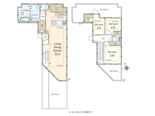 ルーフバルコニー 22.42m2/テラス 14.26m2 |