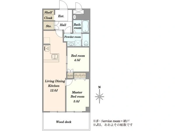 ⇒LDK約12帖、洋室は約5帖・約4帖の2部屋構成。