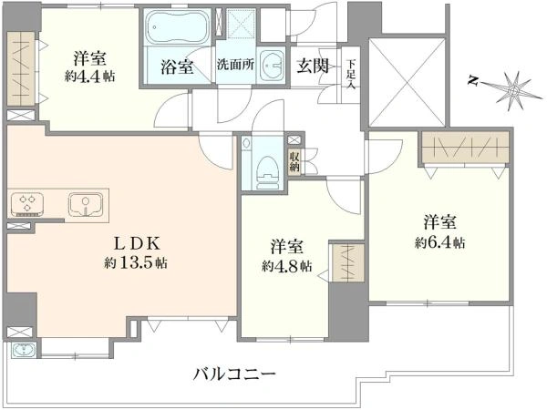 LDK:13.5帖、洋室: 6.4帖、4.8帖、4.4帖