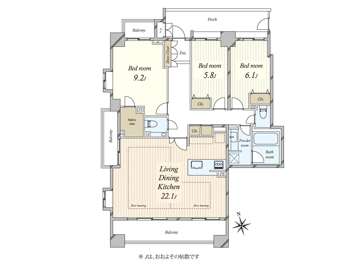 ●専有面積102.72m2・3LDK+WIC ●南・西・北の三方角住戸