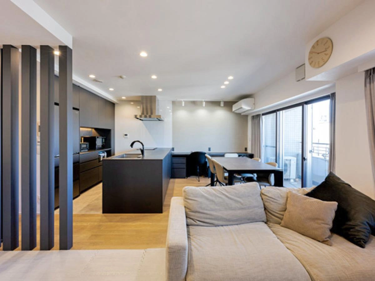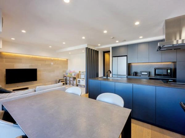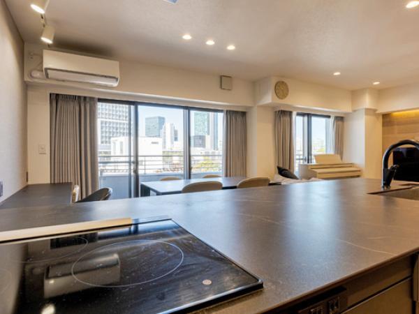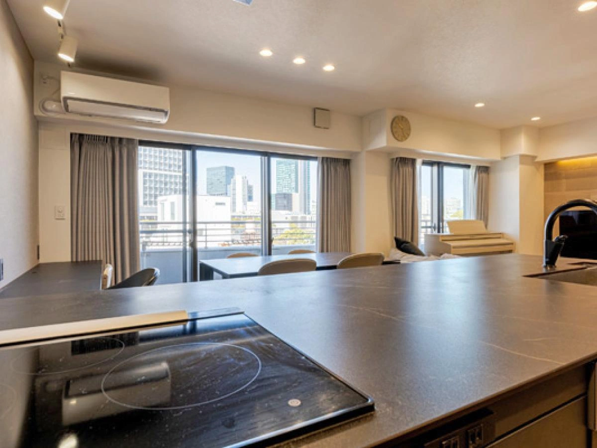 外観:渋谷方面を見渡せるオープンキッチン。 角部屋ならではの採光と視界の抜けが特徴の71㎡・1LDK+納戸