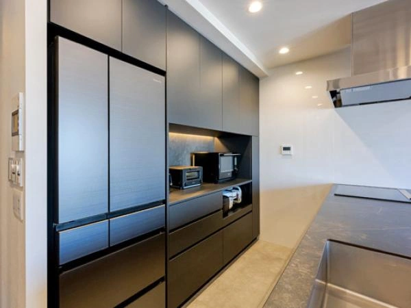 背面にはキッチンと素材を合わせた備え付けのカップボード。