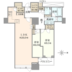 ■2LDK/60.64m2/北西向き住戸 ■廊下部分を抑えた効率的な間取り
