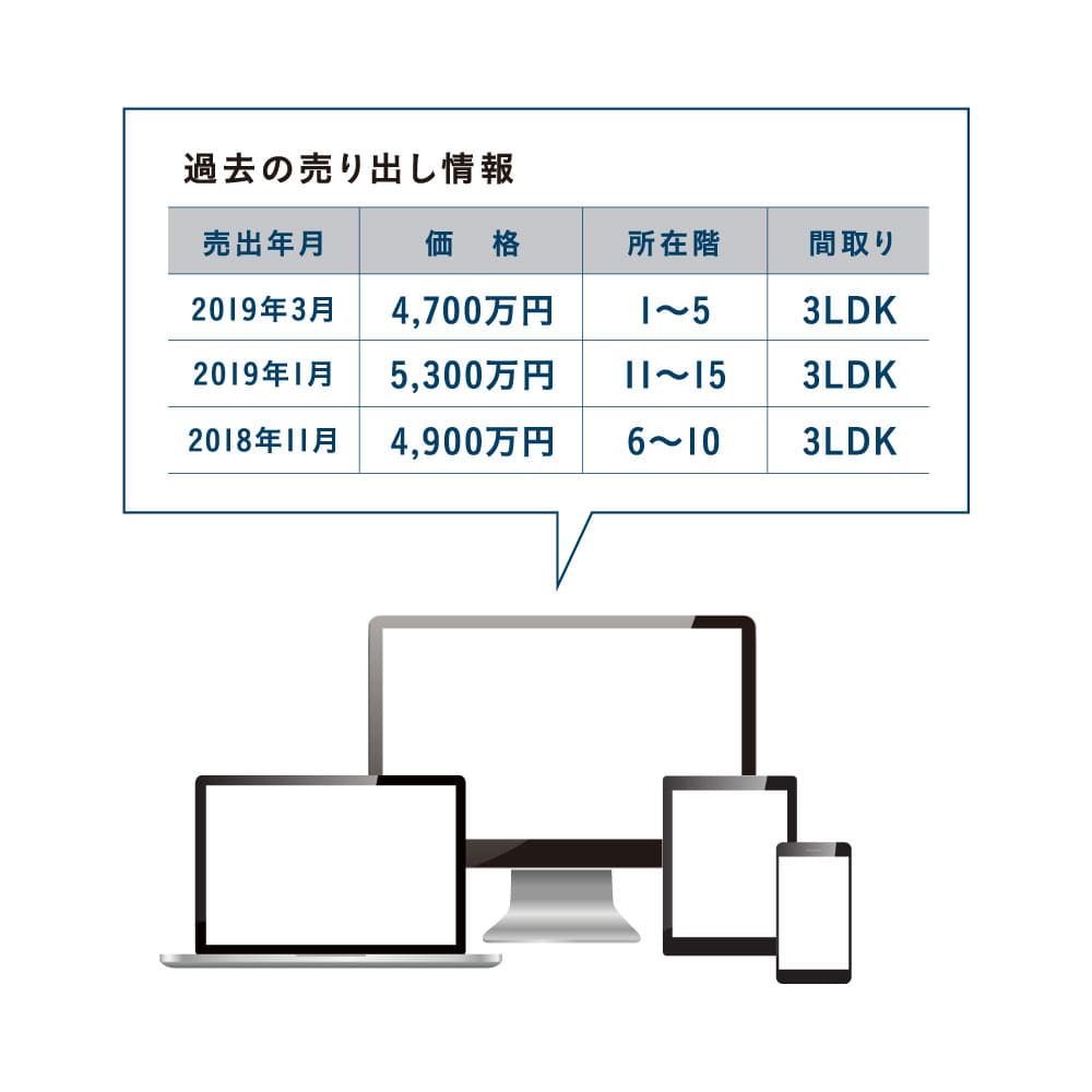 過去に「ノムコム」に掲載されたご所有マンション内の売り出し情報の一覧を確認できます。相場価格などと合わせて、ご売却時期が検討できます。