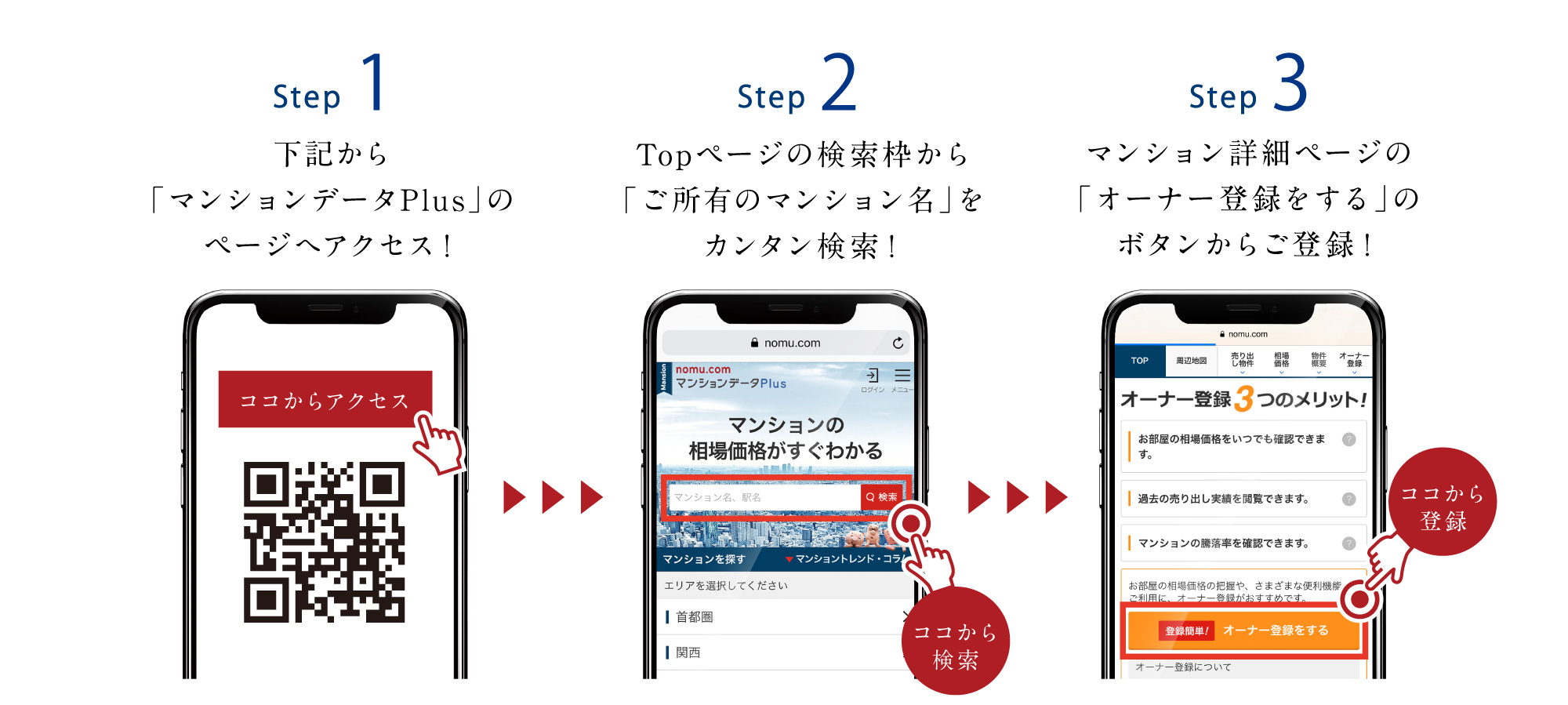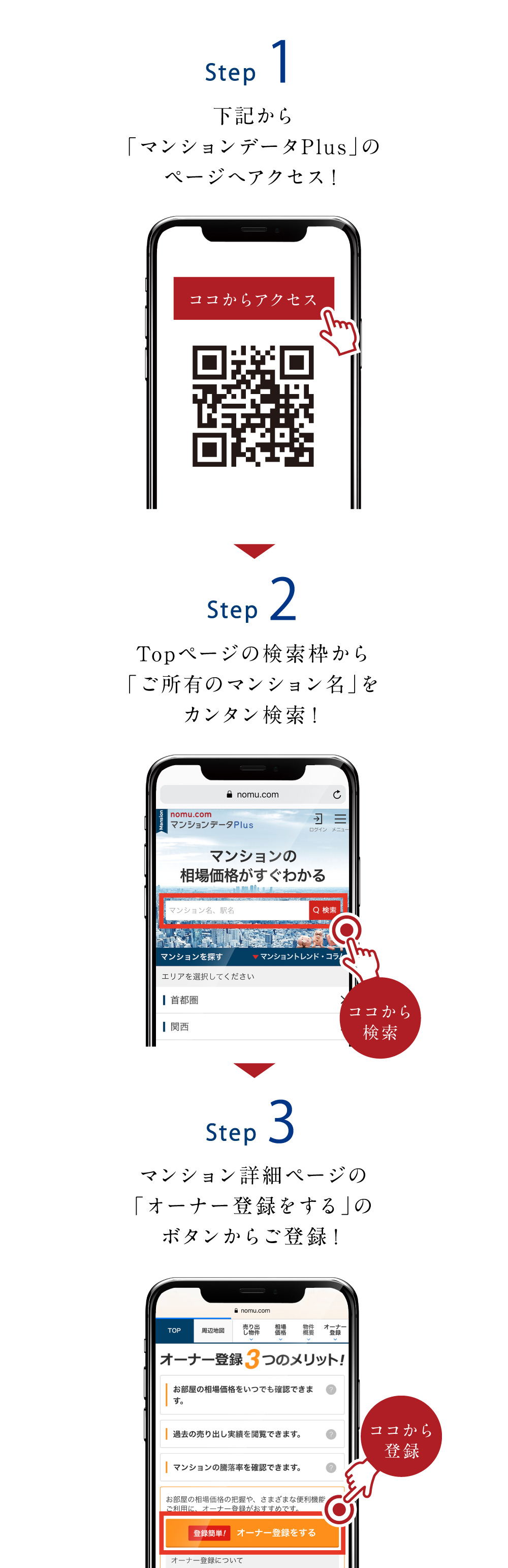 首都圏・関西・名古屋の人気の高い約32,000棟超の推定相場価格や物件情報をいつでも閲覧できるマンションデータベース。「オーナー登録」で、ご自宅の相場価格や過去の売り出し事例、新築時からの価格騰落率など、さまざまな情報が閲覧可能。ご売却時期の検討などに役立ちます。