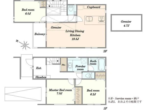 | 備考 | ●建築確認番号 / SJK-KX256010200●都市計画法他制限 / 準防火地域、第1種高度地区 ※1階:54.2m2:車庫面積5.45m2・備蓄庫1.65m2を含む ※S=納戸 |
