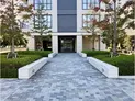 整然と立ち並ぶ樹々が迎え入れる都会的な広場