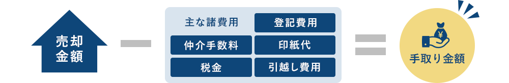 ![売却金額-(主な諸費用[仲介手数料・税金・登記費用・印紙代・引越し費用])=手取り金額](img/sp_price_img02.png)