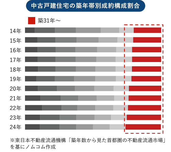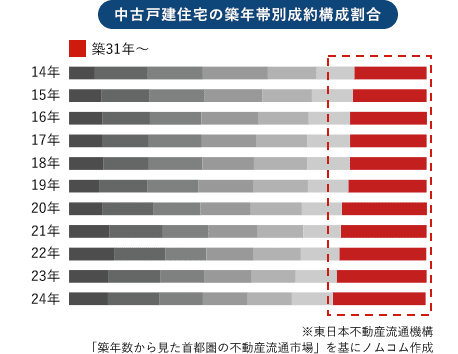 首都圏の中古戸建住宅における成約物件の構成比率では、築31年以上の物件が過去10年間にわたり最多、古屋があっても売却が可能であることがうかがえます。
